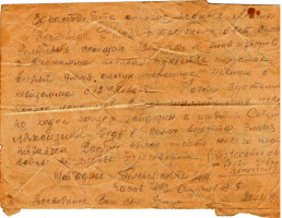 Здравствуйте мои дорогие родные. Мама и сестрица Наташа и так же привет семье Голубевых. Сообщаю вам, что я жив и здоров и вуотамма конжа туннетях торуамах, виеля эммя оллун торашша. Тяшшя ё шейзомма с 12 января. Наголи вуотамма конжа лопичев война, шиллойн миэ наверное кодих эдизех зайдизин, а шидя и Сибири ляксизин, ведь ё колме вуотта эммя нагичен. Вообще сейчас писать нечего, после войны на словах переговорим.